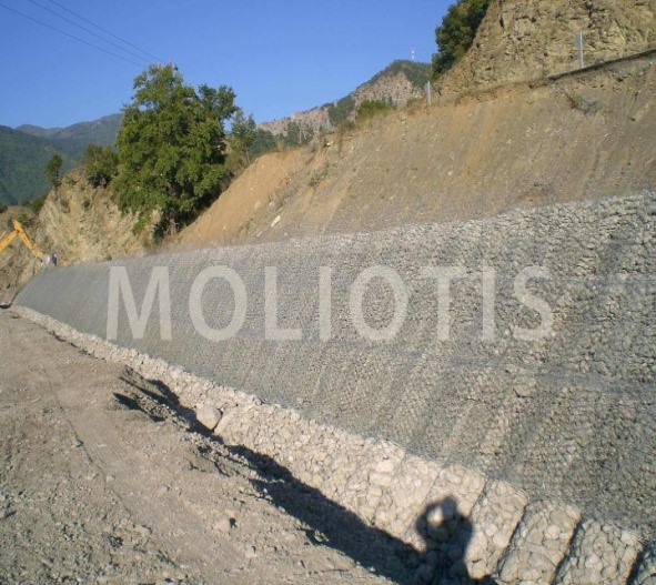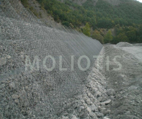 The wire cylinders are cylindrical wire boxes with a diameter of 0.50 – 1.00m and a height of 1.00 – 3.00m (the dimensions are determined on a case-by-case basis by the study of the protection works). The most common dimensions are 2mX0.60m, 2mX0.90m , 3mX0.60m & 3mX0.90m. They are reinforced with wire of a larger diameter in height. They are applied to slope linings, to protect the foot of slopes and bed layers of streams, rivers and other projects as well as for the foundation of constructions from other types of wire boxes, as their flexibility and shape allows easier adaptation to the ground.